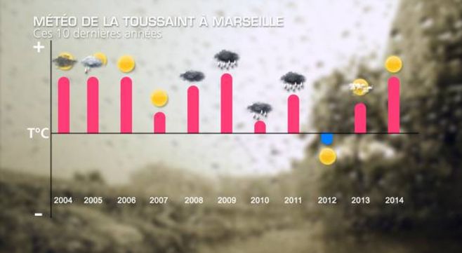 Si l'on regarde le temps qu'il a fait en France lors de ces dix dernières années à la Toussaint, on s'aperçoit que la douceur était majoritaire (notre infographie, avec l'exemple de deux villes : Paris et Marseille).