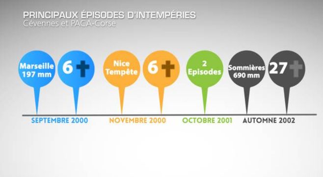 Depuis les années 1990, voici une liste des principaux épisodes survenus en particulier sur les Cévennes, la région PACA et la Corse. Le Roussillon fait l'objet d'une autre enquête de la Chaine Météo.