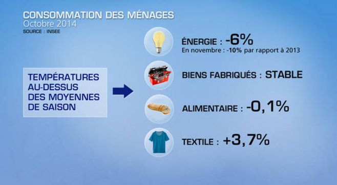 D'après les chiffres de l'INSEE, en octobre 2014, la consommation des ménages Français en énergie a baissé de 6%, son plus bas niveau depuis novembre 1997. Les chiffres concernant le mois de novembre sortiront à la fin du mois de décembre, le temps de récupérer les données.