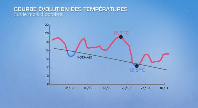 Si l'on n'a pas battu de records mensuels de chaleur, de nombreux records journaliers et décadaires ont été battus. Le week-end des 18 et 19 octobre a été exceptionnellement doux avec des températures records : 25,1°C à Paris, 27,9°C à Saint-Etienne, 31,5°C à Dax et même jusqu'à 34,7°C à Sartène en Corse.