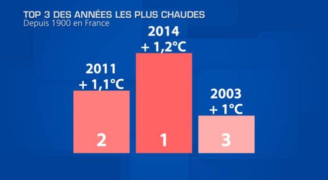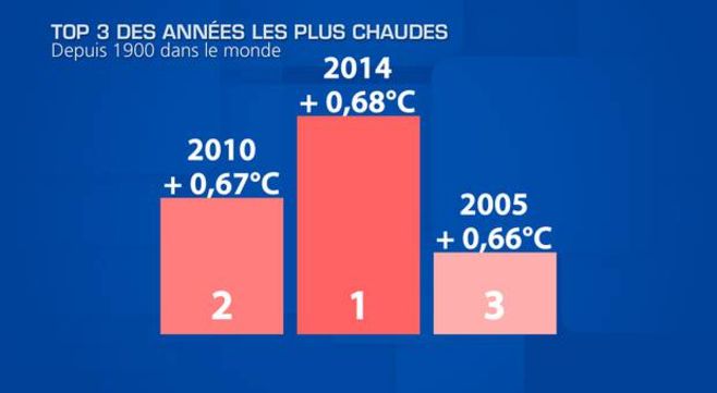 2014 sera donc très probablement l'année la plus chaude enregistrée au niveau planétaire depuis le début des relevés météo fiables (1900) devant 2010 et 2005 : ces trois années se tiennent dans un mouchoir de poche, les différences se jouant au centième de degré près. La France est également en passe d'être l'année la plus chaude avec une bonne avance sur les précédentes, qui furent 2011 et 2003. Il est important de noter, comme l'indique l'Organisation Météorologique Mondiale (OMM) que " les valeurs afférentes aux années les plus chaudes ne diffèrent que de quelques centièmes de degré les unes des autres, et que le classement varie légèrement selon le jeu de données considéré".