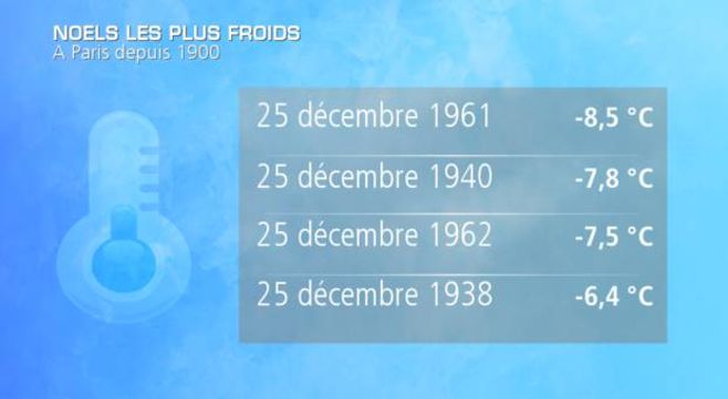 Certaines journées de Noëls ont été marquées par des températures très basses, sans aucun dégel. Cela a été le cas pour l'année 1908 avec 0°C en milieu de journée. D'autres Noëls ont été glacials : en 1938, la température n'a pas dépassé -3°C dans la capitale. Il s'agit du Noël le plus froid jamais mesuré sur Paris. En 1933, on n'a pas dépassé -2,1°C. Le dernier Noël très froid à Paris, sans dégel, remonte à 1996, avec -0,2°C de maximum. D'une manière plus globale, Paris a connu 10 Noëls sans aucun dégel depuis 1900. La température la plus basse un matin de Noël a été atteinte le 25 décembre 1961 avec -8,5°C, suivi de celui de 1940, en pleine guerre (-7,8°C). Les Noëls 1962 et 1938 ont également été particulièrement rigoureux puisque le thermomètre est descendu à -7,5 et -6,4°C respectivement.