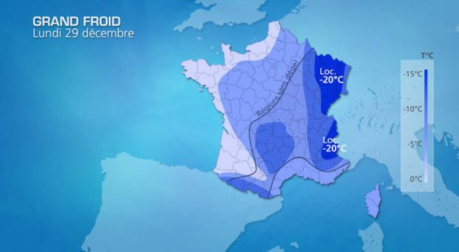 En matinée, les gelées sont sévères sur l'ensemble du pays, avec des températures parfois voisines de -12°C dans le Centre-Est, et de -7 à -1°C ailleurs. Près de la Méditerranée, même s'il ne gèle pas partout, l'ambiance est rendue glaciale par un violent mistral. Côté ciel, le soleil domine facilement, mais une dégradation nuageuse et faiblement neigeuse se met en place près des frontières de l'Est le matin et gagne vers toutes les régions situées au nord de la Seine à la mi-journée. Les chutes de neige seront un peu plus marquées en Lorraine et en Alsace.