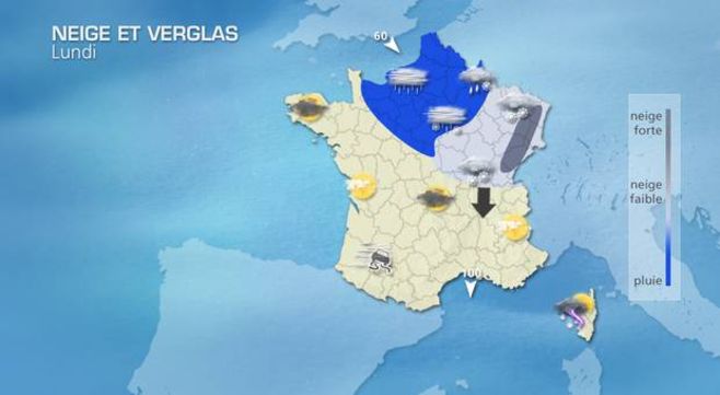 Ainsi, l'après-midi, dans une masse d'air qui reste froide, quelques flocons sont attendus au nord de la Seine. Cette dégradation envahit avant le début de soirée toutes les régions du nord, jusqu'au Poitou en se dirigeant vers le nord de Rhône-Alpes, avec quelques bruines de l'Orlénais au Poitou, et plutôt des flocons en direction de la Bourgogne et de la Franche-Comté (où ile neigera de manière plus soutenue).