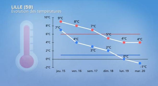 Avec l'orientation du vent au nord-ouest, il ne sera plus question de douceur. Les températures retrouveront tout simplement un niveau de saison où légèrement en dessous. Toutefois, en raison de l'humidité ambiante, du vent très sensible et des températures élevées ces derniers jour, le ressenti s’avérera froid et par conséquent assez désagréable. Les valeurs minimales s’échelonneront de -4°C à +4°C, d’est en ouest. Aux heures les plus chaudes, les températures auront bien du mal à dépasser le 0°C dans les régions les plus à l’est et au nord-est alors qu’elles atteindront 7 ou 8°C à proximité du littoral atlantique et méditerranéen.