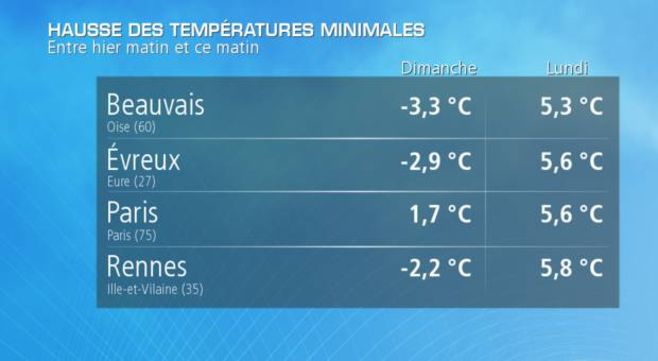 Ce week-end, les températures minimales étaient en dessous des moyennes de saison sur la quasi-totalité du pays et le plus souvent négatives au lever du jour. Nous avons observé -3,3°C pour commencer la journée de dimanche à Beauvais (60) et -2.2°C au lever du jour à Rennes (35). Sur les régions où le ciel était dégagé, les gelées étaient marquées.