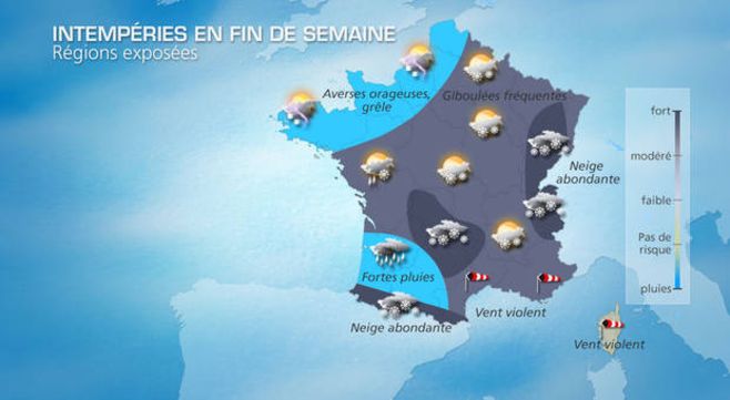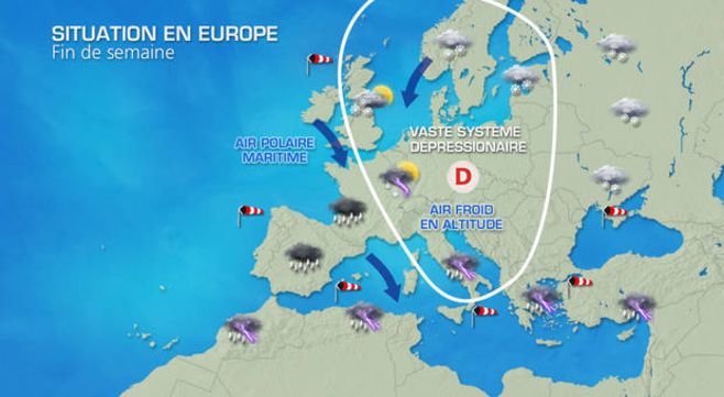 La situation météo s'annonce particulièrement agitée pour cette fin de semaine sur la France. Le responsable est un système dépressionnaire de grande ampleur qui va s'étendre de l'Europe du Nord jusqu'à la Méditerranée. La France sera sous l'influence d'un régime de nord-ouest faisant circuler de l'air polaire maritime très instable.