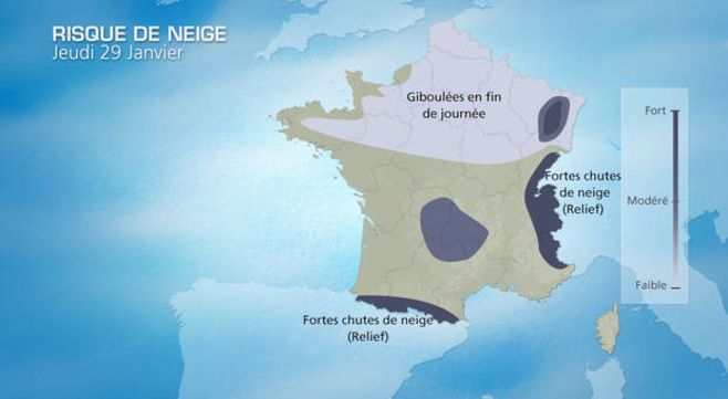 En montagne de fortes chutes de neige se produiront sur les Pyrénées au-dessus de 1500 m jeudi puis 800 m vendredi. Cette limite pluie-neige continuera de s'abaisser pendant le week-end. On attend des cumuls de plus d'1 mètre de neige d'ici dimanche vers 1500 m. Les contreforts ouest du Massif-Central seront également concernés par de fortes chutes de neige. On attend 40 à 50 cm vers 1000 m d'altitude. Plus à l'est, les Alpes du Nord seront touchées par d'abondantes chutes de neige dès la nuit de mercredi à jeudi ; celles-ci s'annoncent durables avec là aussi des quantités de neige qui pourront atteindre le mètre d'ici le week-end, sur les versants exposés au flux de nord-ouest. Dans les Vosges et le Jura les quantités devraient varier entre 30 et 50 cm vers 1000 à 1200 m d'altitude. Les Alpes du Sud et la montagne Corse seront un peu moins bien servies avec 10 à 30 cm.