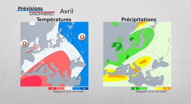 Avril : un temps globalement de saison, mais marqué par de fortes amplitudes thermiques. Plutôt frais en première décade et devenant assez conforme ensuite. Les précipitations seraient dans les normales, voire excédentaire dans l'est de la France et sur nos montagnes.