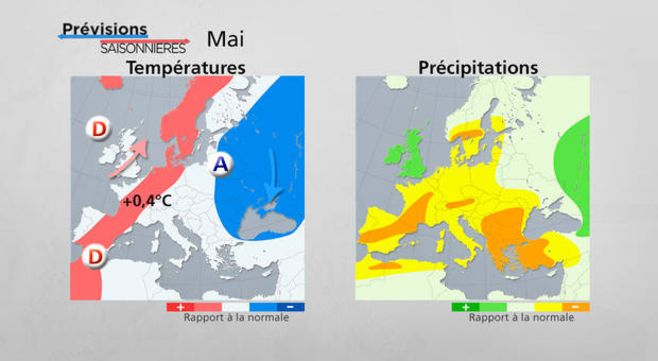 Mai : A priori un mois "de saison", sans anomalie particulière de température. Une incertitude persiste au sujet des précipitations, qui pourraient être plus importantes que prévu initialement (les précipitations prévues déficitaires pourraient rester finalement dans les normales). Ce mois commencerait par de la fraîcheur avant une remontée durable des températures et les premières chaleurs orageuses à partir de la 2ème décade.