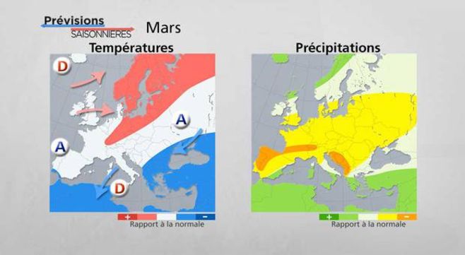 Mars : la tendance est révisée au vu des dernières sorties numériques: les précipitations seront légèrement déficitaires sur la France, en raison de fréquentes journées anticycloniques, tandis que les températures seraient simplement "de saison", sans anomalie particulière.