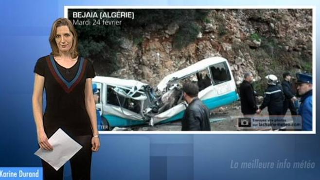 Six personnes ont été tuées et vingt autres blessées dans un éboulement à Béjaïa, en petite Kabylie, ce mardi. Les rochers sont tombés sur une route fréquentée, écrasant un bus de 30 places, un minibus de 12 places et deux voitures. Le risque d'inondations, coulées de boue et éboulements avait été annoncé depuis le début de la semaine par La Chaîne Météo en raison de fortes pluies.