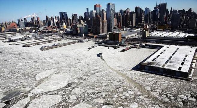 On retrouve cette anomalie froide en février sur l’ensemble de l’est du Canada (Québec, Ontario, provinces maritimes) et le nord-est des Etats-Unis, et notamment à New York, où la mer commence à geler !