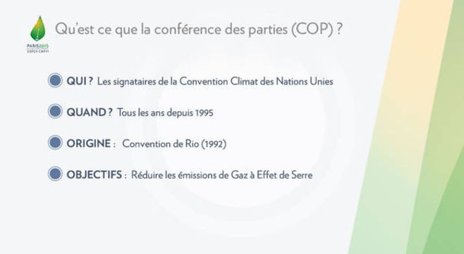 La « COP » est une conférence des Nations-Unies : il s’agit de la 21ème conférence des « Parties » signataires de la Convention Climat des Nations-Unies adoptée lors de la conférence de Rio (Brésil) en 1992. Ces conférences se tiennent chaque année dans un pays différent (l’année dernière, elle se tenait à Lima (Pérou) : la première eu lieu à Berlin en 1995.
