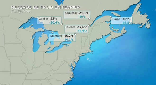 Sur quasiment l’ensemble du territoire québécois (excepté la Gaspésie), les températures moyennes de ce mois de février sont les plus froides jamais enregistrées. A Montréal, il a fait par exemple -15,2°C, la précédente température moyenne la plus froide datait de 1993 avec -14,1°C, pour une normale se situant aux alentours de -8°C. Ce constat est valable dans quasiment l’ensemble des villes du Québec, et notamment dans la ville du même nom. D’ailleurs, alors que les températures repassent au-dessus de 0°C environ 3 à 9 fois par mois (du nord au sud) en moyenne, sur ce mois de février 2015, aucun dégel n’a été constaté.