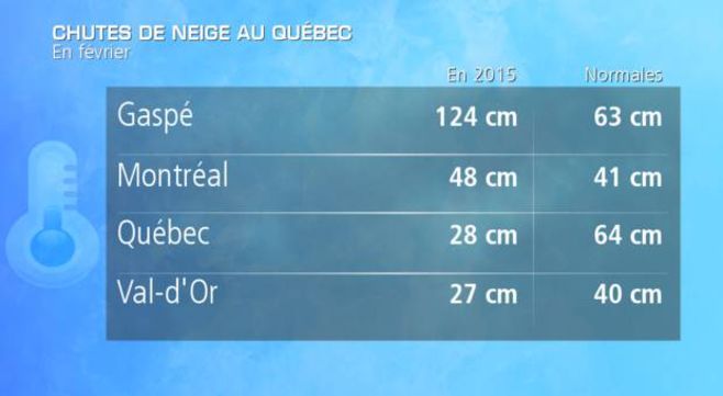 Concernant les chutes de neige en revanche, pas de record, mais un gros contraste entre le nord et le sud de la région. Si les chutes de neige ont été moins abondantes qu’en temps normal sur le nord (Val-d’Or, Québec…), ce ne fut pas le cas sur le sud de la région (Montréal, Gaspésie), avec notamment 1 mètre 20 de neige à Gaspé (moitié moins en temps normal). Ceci s’expliquer par le fait que les différentes perturbations ayant amenées d’énormes quantités de neige sur le nord-est des USA ont touchées le sud du Québec, mais pas le nord, où c’est le froid qui a régné en maître.