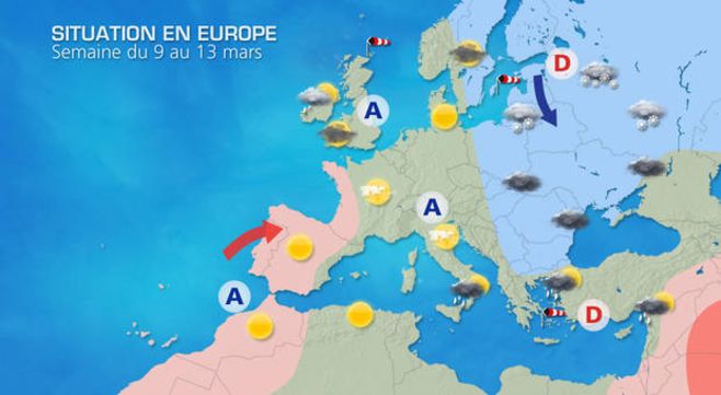 Après un week-end calme et très doux, le début de cette semaine s'annonce un peu plus mitigé au nord lundi et mardi, en marge d'une dépression qui balaie le nord des Îles Britanniques, avec un ciel très nuageux des régions atlantiques au Nord-est (quelques gouttes sont même possibles mardi sur les régions voisines de la Manche). Les températures baissent. Des Pyrénées aux Alpes, le ciel prend un aspect voilé lundi, sans atténuer l'impression de beau temps.