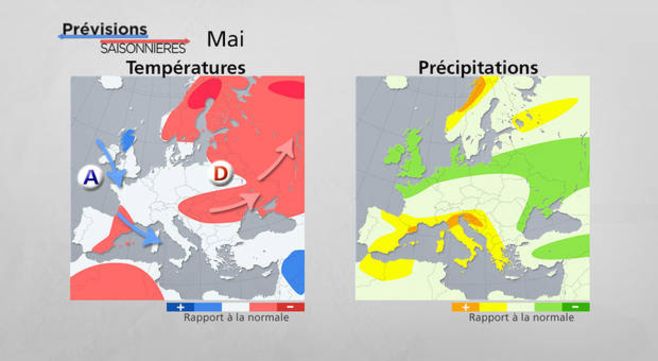 Mai : de saison. Avec la prédominance des hautes pressions sur le proche Atlantique, le flux dominant serait de secteur nord-ouest sur la France. Dans ce contexte, les températures et les précipitations seraient de saison, avec cependant une certaine sécheresse dans le sud, notamment autour de la Méditerranée, avec des épisodes récurrents de Mistral et de Tramontane.