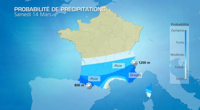 Des pluies faibles et intermittentes s’étirent en matinée du sud-ouest jusqu’aux régions du centre-est ainsi qu’entre la Côte d’Azur et la Corse, avec de la neige sur le Massif Central, les Pyrénées et les Alpes au-dessus de 800 à 1200 mètres d’altitude. Dans l’après-midi, les précipitations se bloquent sur les Pyrénées et persistent entre l’Auvergne, les Cévennes, les Alpes. Dans l’extrême sud-est et l’île de beauté, les intempéries se renforcent avec un communiqué spécial. Le golfe du Lion est épargné avec un ciel le plus variable et un temps sec.