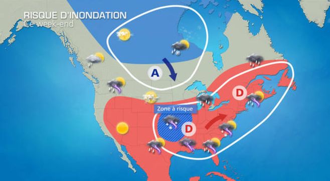 De violents orages ont de nouveau lieu sur les états allant du Dakota du Nord au Texas ce qui continue de d'apporter de fortes précipitations jusqu'au week-end inclus aggravant la situation sur le front des inondations. De nouveaux records de pluies devraient à nouveau être battus pour un mois de mai ce dernier week-end de mai alors que jusqu'en mars dernier ces états connaissaient l'une des pires sécheresses de leur histoire.