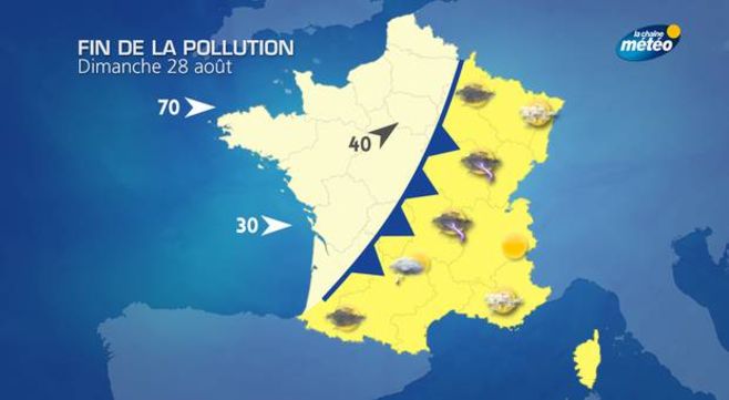 Dimanche, une perturbation peu active mais arrivant de l'atlantique va repousser les polluants vers l'Europe centrale. A l'ouest, la canicule et la pollution disparaîtreront de paire.