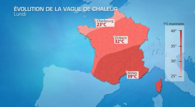 Avant la baisse des températures du milieu de semaine, il faut encore s'attendre à de très fortes chaleurs, en particulier dans le sud du pays pour la journée de lundi, avec de 35 à 38 voire localement 40°C entre l'Aquitaine, la région Midi-Pyrénées, le Languedoc-Roussillon, la Provence, la basse vallée du Rhône et l'Auvergne. Temporairement, les régions du nord-est et du centre-est connaîtront une baisse sensible (entre 30 et 34°C). Pendant ce temps, l'air demeure plus respirable dans le nord-ouest et au nord de la Seine avec des maximales de l'ordre de 24 à 28°C. Côté ciel, le soleil l'emportera généreusement, l'anticyclone venant se positionner sur la France. Quelques ondées orageuses peuvent se déclarer l'après-midi sur les Pyrénées, les Alpes et la montagne corse.