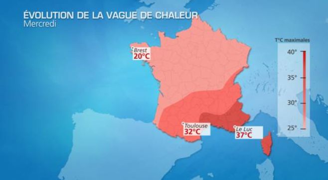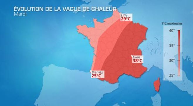 Ce mardi sera la dernière journée à proprement dite de cette vague de chaleur qui aura débuté par le sud-ouest le 30 juin. Attendez-vous en Lorraine, Alsace, Bourgogne, Franche-Comté, Auvergne, Rhône-Alpes, PACA, Midi-Pyrénées et Languedoc-Roussillon à un soleil de plomd et à des maximales comprises entre 34 et 38°C, avec localement des pointes à 40°C dans le centre-est. Partout ailleurs, pas de changement par rapport au niveau du mercure alors que le ciel sera plus menaçant que la veille avec un risque d'averses très localement orageuses.