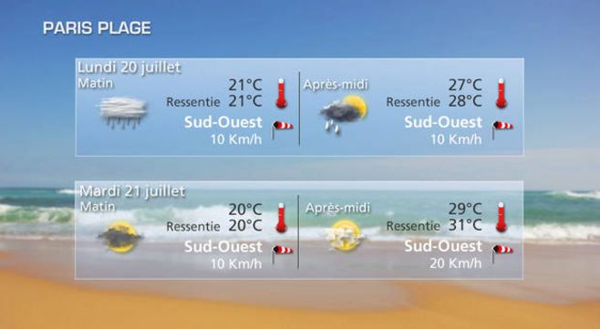 On se souvient que l'année dernière, la météo avait joué les trouble-fête. Du 20 juillet au 6 août, la météo a été clémente, avec un soleil assez généreux. Mais après le 6 août, une dépression avait eu la mauvaise idée de venir se positionner sur les îles britanniques et de ne plus en bouger. Ainsi, la fin de l'opération de Paris-Plage s'en est trouvée affectée, avec une météo automnale et fraîche, ponctuée d'averses. En cette fin du mois de juillet, il fera assez chaud malgré quelques nuages. Puis une période un peu plus mitigée est annoncée pour le prochain week-end, avant le retour du soleil et d'une chaleur modérée à partir du 1er août.