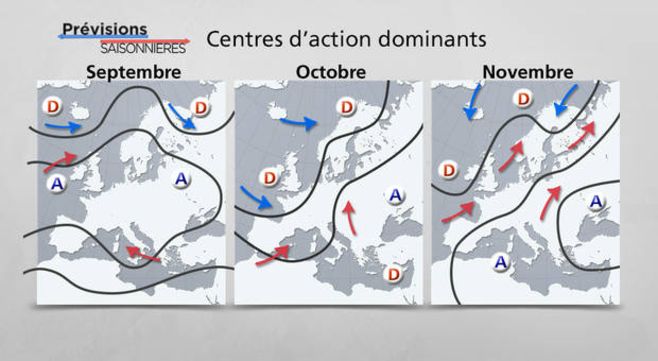 A partir d’octobre, selon une chronologie à affiner, les perturbations atlantiques commenceront à circuler au niveau des îles britanniques, affectant la moitié nord de la France. Cette configuration, marquée par un flux de sud-ouest récurrent, devrait caractériser également le mois de novembre.