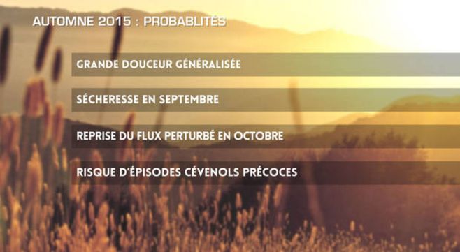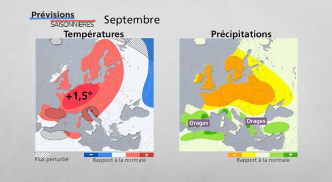 SEPTEMBRE : beau temps sec avec des températures supérieures aux moyennes. Les précipitations resteront déficitaires sur la moitié nord malgré le passage de quelques perturbations océaniques. Au sud, les orages concerneront les reliefs mais une incertitude concerne le pourtour de la Méditerranée: les épisodes cévenols pourraient commencer tôt dans la saison, notamment en languedoc-Roussillon.