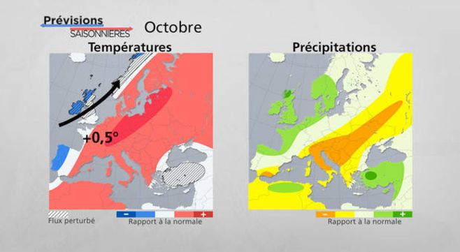 OCTOBRE : dans un contexte restant doux, les perturbations océaniques reviennent progressivement dans un flux de sud-ouest à ouest. Le pourtour méditerranéen pourrait être moins exposé aux intempéries qu’en septembre, mais le contexte reste à risque.