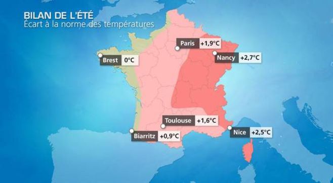 C'est dans l'est et le sud-est du pays que les températures ont été les plus élevées avec un excédent de l'ordre de 2 à 3°C entre la Lorraine, l'Alsace, la Bourgogne, la Franche-Comté, l'Auvergne, la région Rhône-Alpes ou encore entre la Côte d'Azur et la Corse. En revanche, en raison de la circulation d'un air plus maritime près de l'océan et en bord de Manche, la température moyenne de cet été 2015 affiche un niveau conforme aux normales voire supérieur de quelques dixièmes à cette même norme.