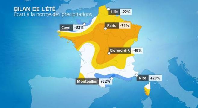 Si aucune inquiétude particulière n'était d'actualité à la fin du printemps concernant le risque de sécheresse (en raison notamment d'un niveau des nappes phréatiques très correct, avec un taux de remplissage de l'ordre de 75 à 85%), la situation a rapidement évolué en raison de l'omniprésence des hautes pressions. L'anticyclone a ainsi fait barrage aux perturbations atlantiques tandis que le nombre de dégradations orageuses estivales est resté faible. Ainsi, le déificit pluviométrique atteint en cette fin d'été jusqu'à -70%, notamment entre le val de Loire et le quart nord-est du pays, en passant par l'Auvergne, le Limousin ou encore le Bassin Parisien.