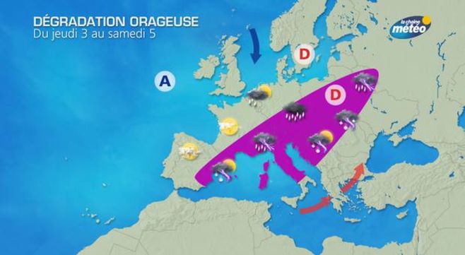 Avec le retour des hautes pressions par l'Europe de l'ouest c'est un flux de nord qui concerne tout le nord et l’ouest de l’Europe. Il apporte de l’air très frais pour la saison tandis que l’air chaud se réfugie de la Méditerranée à la mer Noire. Entre les deux, les régions allant de Valence aux Pyrénées et remontant vers l’Italie, les Balkans et la Biélorussie seront concernées par une dégradation orageuse généralisée et marquée.