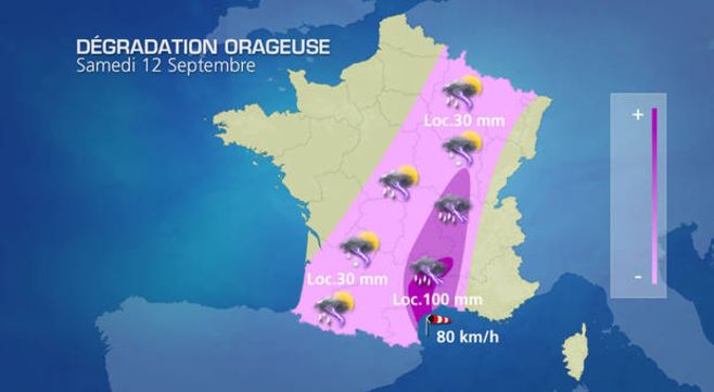 Dimanche, la perturbation pluvio-orageuse se décalera progressivement vers la région PACA où les précipitations se feront sous forme de fortes averses orageuses. Des précipitations s'attarderont encore sur les Cévennes où l'épisode ne prendra fin que la nuit suivante.