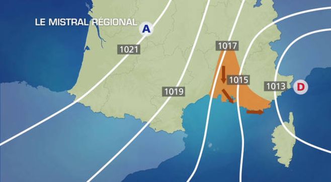 Lorsque la dépression du golfe de Gênes s'étend jusque sur le Var et la mer de Ligure, seule la vallée du Rhône et la Camargue subissent le mistral. Dans cette zone géographique restreinte, le reserrement important des isobares (lignes d'égale pression) est à l'origine d'un vent violent avec des rafales qui peuvent dans certains cas atteindre 120 à 130 km/h.