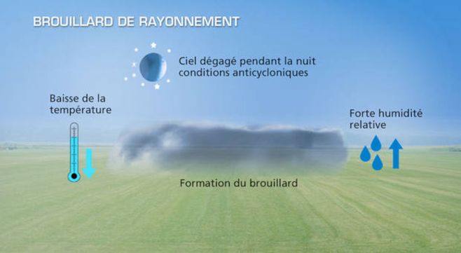 Le brouillard de rayonnement qui est le type de brouillard le plus fréquent dans nos régions se forme généralement en fin de nuit lorsque le temps est calme avec un ciel dégagé et un vent faible. Les conditions anticycloniques sont donc propices à la formation des brouillards. Au cours de la nuit, le refroidissement important à proximité du sol par "rayonnement" entraîne une augmentation de l'humidité. Il y a condensation avec formation de la rosée. Si l'humidité et le froid sont suffisants, il y a saturation de l'air et la vapeur d'eau se condense en fines gouttelettes de brouillard. En général le brouillard se dissipe dans la matinée mais en hiver il est parfois très long à se dissiper, il peut même dans certains cas, au coeur des anticyclones, persister toute la journée.