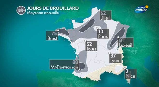 Les régions les moins exposées sont celles du sud-est car l'air y est plus sec et le vent souvent présent. A noter aussi de moins en moins de brouillard au coeur de l'agglomération parisienne en raison de l'îlot de chaleur urbain. La densité du bâti et les chauffages urbains limitent le refroidissement nocturne et l'humidité y est plus faible. Dans Paris on ne compte plus qu'une dizaine de jours de brouillards par an contre une quarantaine en périphérie de l'agglomération.