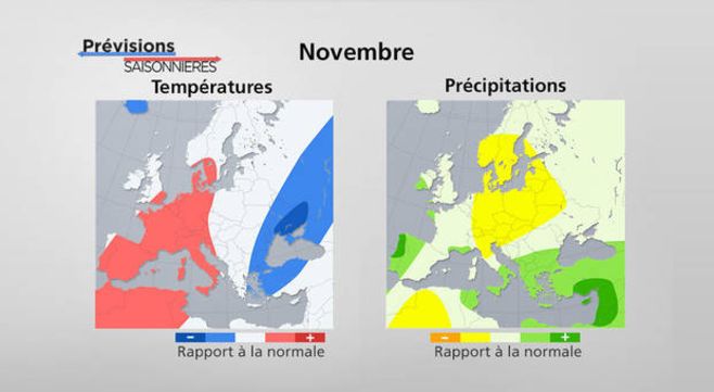 - Novembre : Des températures conformes aux moyennes, voire légèrement supérieures, et des précipitations normales mais hétérogènes, toujours plus abondantes au sud.
