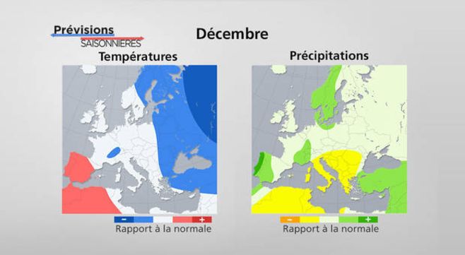 - Décembre : Températures de saison, voire légèrement inférieures. Ambiance hivernale. Précipitations dans les moyennes, toujours plus abondantes sur la bordure méditerranéenne.
