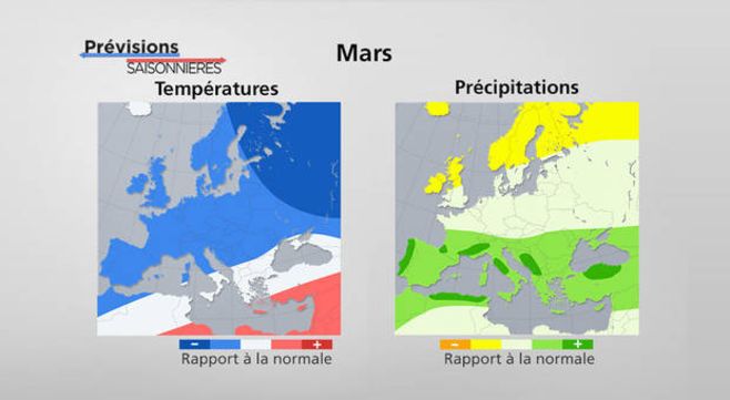 - Mars : Le mois le plus froid de l’hiver. Anomalie marquée de –2° à –3° sur la France. Précipitations abondantes, risque significatif de neige en plaine.
