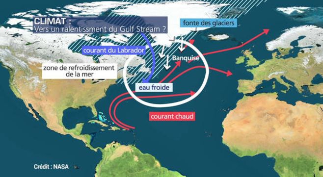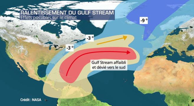 Cet apport d’eau froide pourrait déséquilibrer le climat de cette partie de l’hémisphère nord, avec des répercussions inconnues pour l’instant. Selon une étude publiée récemment par l’université de Southampton (UK), le Gulf Stream, ce courant marin chaud qui remonte le long de la côte Est des Etats-Unis et qui se dirige vers l’Europe de l’ouest, pourrait être freiné et repoussé vers le sud : son effet modérateur du climat de l’est américain et de l’ouest européen serait alors atténué très rapidement. On parlerait "d’effondrement" de la circulation de l’Atlantique Nord (« AMOC »).