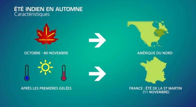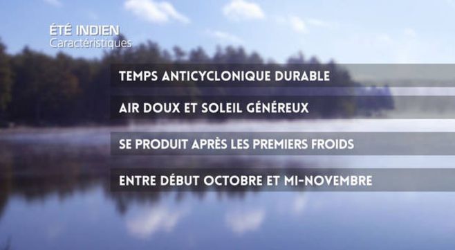 Si la saison automnale se caractérise par une diminution de l’ensoleillement et un retour progressif de l’air froid, l’été indien se produit lorsqu’un flux d’altitude lent entraîne un blocage de la circulation atmosphérique avec un anticyclone installé sur le continent. Les vents, qui sont établis au secteur sud, ont pour conséquence l’arrivée de masses d'air très douces, voire chaudes et de conditions stables. Ce temps agréable donne l’illusion de retourner dans une période estivale pendant quelques jours. Utilisée trop fréquemment, l’expression est souvent galvaudée et régulièrement utilisée pour parler des périodes d’ensoleillement tardives. En réalité il faut que les températures soient supérieures d'au moins 5°C à la normale pendant plus de 3 jours, après l'apparition des premières gelées automnales. En France, les gelées sont plus tardives qu'au Canada et les variations de températures moins importantes. Le phénomène est donc plutôt rare. Joe Dassin aurait donc raison de chanter que l'été indien est "une saison qui n'existe que dans le nord de l'Amérique"... Chez nous, on parle parfois "d'été de la saint-Martin" (fêté le 11 novembre) et qui correspond à une belle période de temps doux et ensoleillé.
