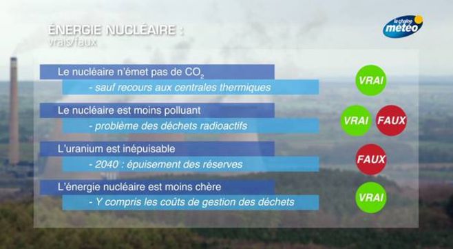 L'avantage climatique du nucléaire est l'absence de rejet de gaz à effet de serre et de polluants dans l'atmosphère. Le nuage que l'on voit au-dessus des tours de refroidissement n'est que de la vapeur d'eau. Cela dit, ce n'est qu'un aspect de la problématique, car en période de pics de consommation, on fait appel aux centrales thermiques à flamme qui émettent du CO². Mais ce n'est rien comparé aux émissions liées à la combustion des énergies fossiles, tel le charbon. D'autre part, les opposants au nucléaire relèvent que l'industrie nucléaire émet des quantités non négligeables de gaz à effet de serre lors de l'extraction de l'uranium et de la fabrication du combustible nucléaire (CO2, mais aussi oxydes d'azote). Un rapport récemment publié par le cabinet indépendant WISE Paris montre d'ailleurs que "la contribution du nucléaire à la réduction des émissions de gaz à effet de serre est trop médiocre pour qu'on puisse le considérer comme une solution".