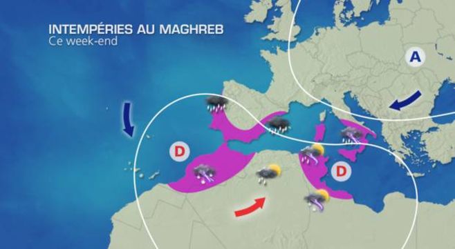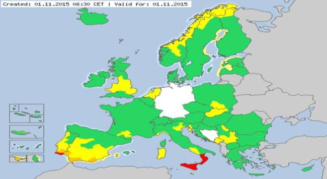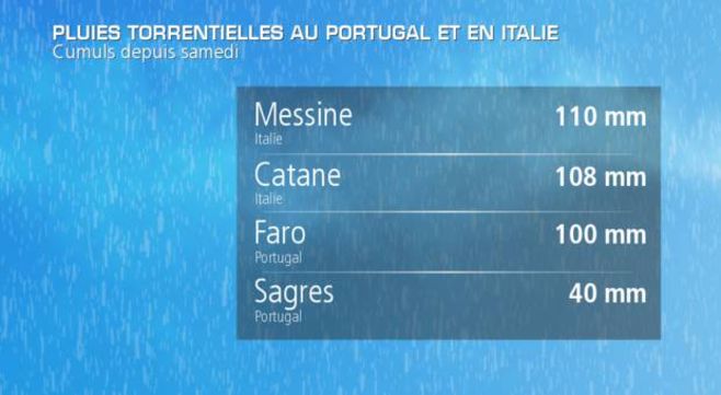 Une première dépression s'est creusée au large des Balkans. Elle provoque de violents orages sur le sud de l'Italie et la Sicile. Une deuxième dépression frappe le Portugal et le sud de l'Espagne. Sur ces pays, l'alerte aux intempéries est maximale.