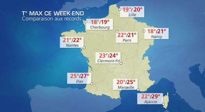 Des records de douceur pourront localement être battus du sud-ouest au Bassin parisien, en passant par l’Auvergne. Les villes telles que Paris, Amiens, Bourges, Angers, Langres, Limoges, Périgueux, Niort... pourraient battre leur record de chaleur mensuel, datant parfois de plus de 50 ans !