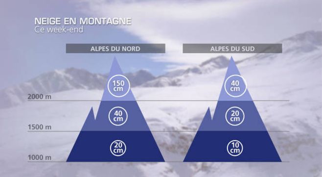 D'importantes chutes de neige sont annoncées sur tous les massifs entre mercredi et vendredi, d'abord à basse altitude puis la limite pluie/neige remontera progressivement vers 1200 mètres jeudi. On attend 30cm de neige fraîche au-dessus de 1300 mètres en moyenne sur tous les reliefs de l'est et parfois plus d'un mètre sur les Pyrénées.