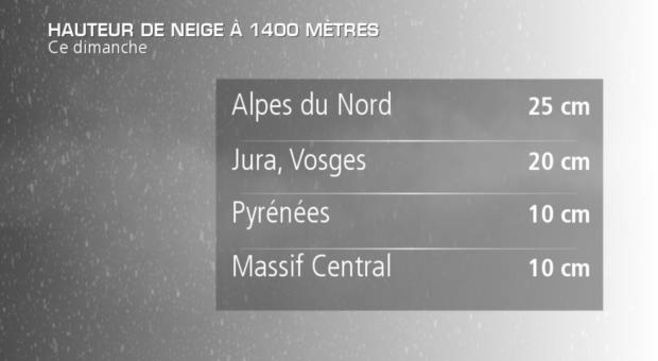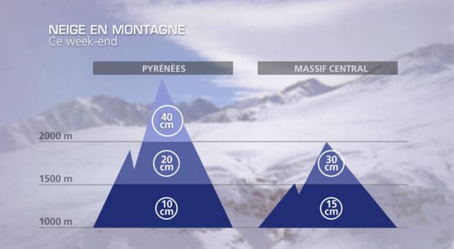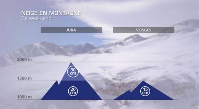 Les sommets du Massif central sont recouverts d'un léger saupoudrage de neige fraîche, sans égaler les quantités relevées sur les Alpes. Sur les Vosges et le Jura, la couche de neige est plus importante, de l'ordre de 15 à 20 cm vers 1300 mètres d'altitude.