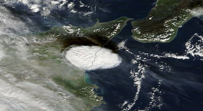 Porté par les vents d'ouest en haute altitude, le nuage de soufre (SO2) s'est déplacé vers la Grèce et le proche Orient (image satellite NASA : le panache de fumée de l'Etna au-dessus de la côte Sicilienne jeudi dernier, prenant la forme d'un foyer orageux).