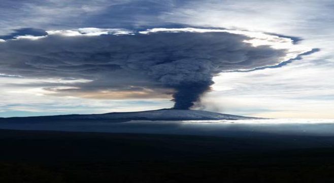 Mais jeudi, une éruption paroxysmique de type "plinienne" s'est déclenchée : de puissantes fontaines de lave se sont enchaînées, s'élevant à 3000 mètres d'altitude. Le panache de cendres volcaniques (formées de soufre et de suie) s'est élevé jusqu'à plus de 15000 mètres d'altitude, atteignant le sommet de la troposphère, prenant alors la forme évasée d'une enclume gigantesque. Ce nuage volcanique est appelé "pyrocumulonimbus", pouvant s'apparenter à des nuages d'orage en raison de leur développement vertical. Ce fut alors l'éruption la plus forte de ces 20 dernières années.